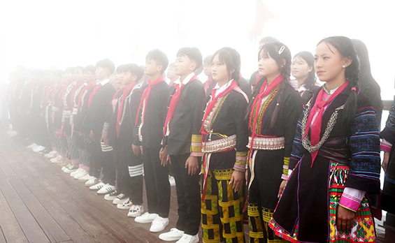 Nghi lễ thượng cờ diễn ra trong không khí trang nghiêm, các đại biểu đặt tay lên ngực trái, hát vang quốc ca trên nóc nhà Đông Dương. Trong không gian rộng lớn, ngắm nhìn mây núi trùng điệp hùng vỹ của quê hương từ độ cao 1.343m, trong lòng mỗi người ngập tràn niềm tự hào khi được là người con đất Việt kiên cường, bất khuất.